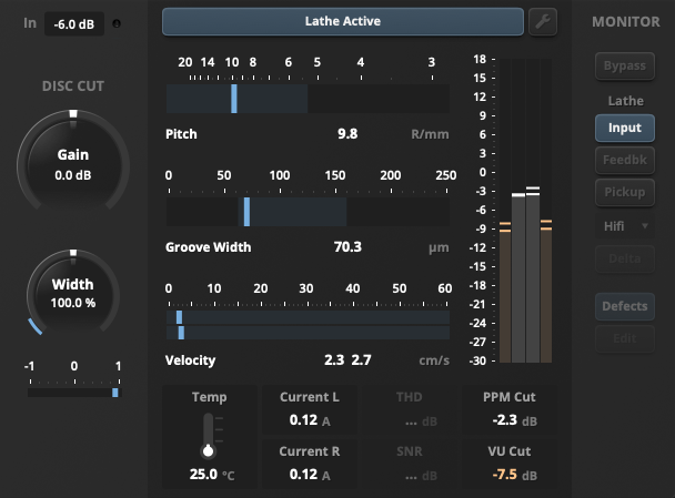 우측에는 디스크 커팅 컨트롤과 래칫 컨트롤 메뉴가 있다. 디스크 커팅 컨트롤에는 게인 레벨 및 스테레오 넓이를 조절할 수 있으며 위상 미터가 있다. 디지털 음원 작업에서는 문제없지만 Vinyl을 제작할 때 스테레오 이미지는 문제가 될 수 있다, 그렇기에 적절히 Gain 및 스테레오 넓이를 조절함으로써 보다 깔끔하게 Vinyl 전용 이미지를 만들어낼 수 있다.