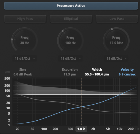 좌측 하단에는 디스크 커팅을 위한 프로세서들이 모여 있다. 좌측부터 로우컷, elliptical, 하이패스 이큐다. 로우 및 하이컷은 다른 EQ에서 찾아볼 수 있는 EQ와 비슷하지만, Ecliptical EQ는 조금 생소할 수도 있다. 모노 크로스피드 필터라 불리는 elliptical EQ는 특정 주파수 이하를 모노 시그널로 바꿔주는 EQ다. 다른 플러그인들에서는 mono maker라는 이름으로 되어 있는 것들을 가끔 본 적 있을 텐데, 같은 기능을 한다. elliptical EQ는 Vinyl 디스크 레코딩 시 불필요한 저음의 진동을 제어하는 데 효과적이며 비트 및 베이스들을 음악의 가운데로 모으는 데 탁월한 역할을 한다. Vinyl 작업에서 필수적인 EQ 중 하나다. 만일 작업하는 음원의 저음역에 스테레오 이미지가 없을 경우에 넘어가도 무방하다.