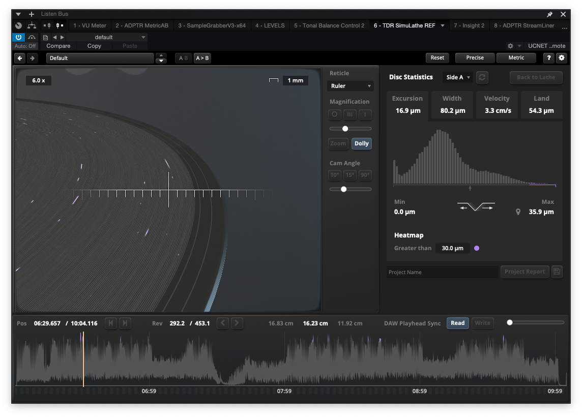 TDR SimuLathe REF에는 단순히 Vinyl 디스크 제작을 위한 도구들만 있는 게 아니다. Simulate라는 이름답게 Vinyl 디스크 제작에 도움이 되는 Disc Statistic을 제공한다. 디스크 통계에서는 현재 디스크에 있는 파형들 중 추후 디스크 제작 시 문제가 될 수 있는 부분들의 표기 및 소릿골 모델링, 재생 헤드의 진동 폭 등 다양한 정보들을 제공하고 있다. 또한 디스크 통계에 수집된 데이터들을 HTML 보고서로 내보낼 수 있는 기능도 제공한다. 가늠자도 십자 형태부터 자 등 다양하게 제공하고 있으므로 다양하게 시도해 보자.
