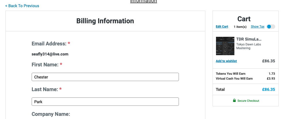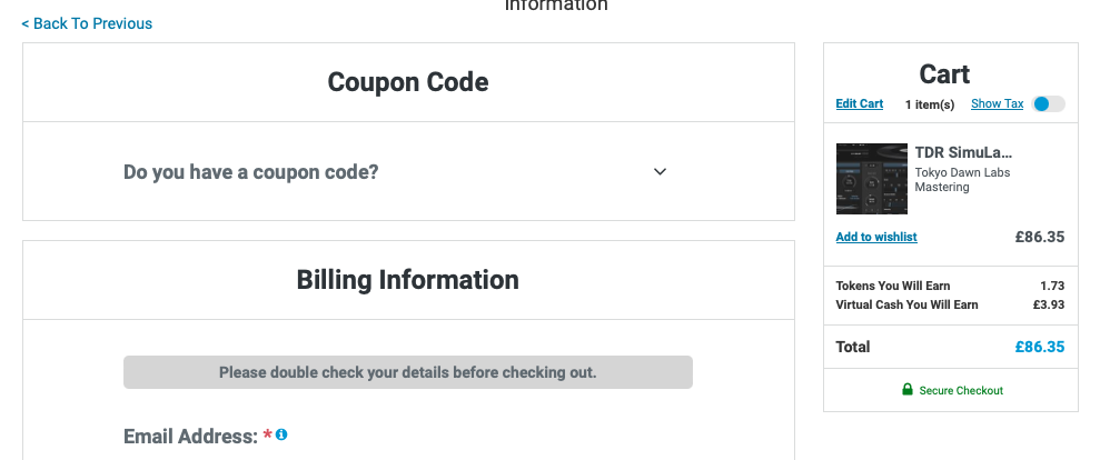 TDR SimuLathe REF 구매 링크 (PluginBoutique)를 클릭하거나, Plugin Boutique(링크)에 접속한 후, 검색창에 "TDR SimuLathe REF"를 검색하면 위와 같은 화면이 나타난다. Plugin Boutique는 회원 가입을 하지 않아도 상품 구매가 가능하지만, 회원 가입을 하는 편이 추후 라이센스 관리에 용이하다. 기본값은 파운드화로 나타나지만 달러나 엔, 유로화로 가격을 바꿔가며 확인할 수 있다. 다만, 대한민국 원은 지원하지 않으므로 해외 결제가 지원되는 카드나 페이팔 계정을 미리 준비할 필요가 있다. Add to Cart를 클릭하여 상품을 내 장바구니로 담자.