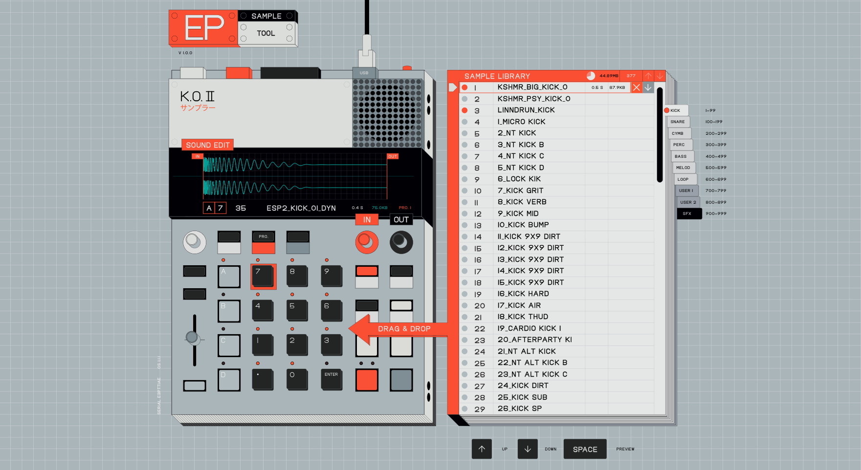 샘플을 녹음한 뒤 샘플러에 추가하는 건 EP-133에서도 충분히 가능하다. 그러나 이미 만들어져 있는 샘플들을 추가할 때는 일일히 레코딩을 떠서 보내줘야 하는가? 에 대한 의문이 생긴다. 물론 직접 넣을 수도 있다. EP-133은 샘플을 넣을 수 있는 EP Sample Tool을 제공하고 있다. 업데이트 프로그램과 마찬가지로 웹 브라우저를 통해 관리된다. Safari에서는 Web-MIDI를 지원하지 않아서 Chrome 브라우저에서 EP Sample Tool을 실행한 후, EP-133을 USB로 연결하면 내장되어 있는 샘플들을 한 번에 확인할 수 있다. 또한 레코딩한 샘플이 있다면 다운로드해서 백업 또한 가능하다. 웹 브라우저이지만 있을 건 다 있다.