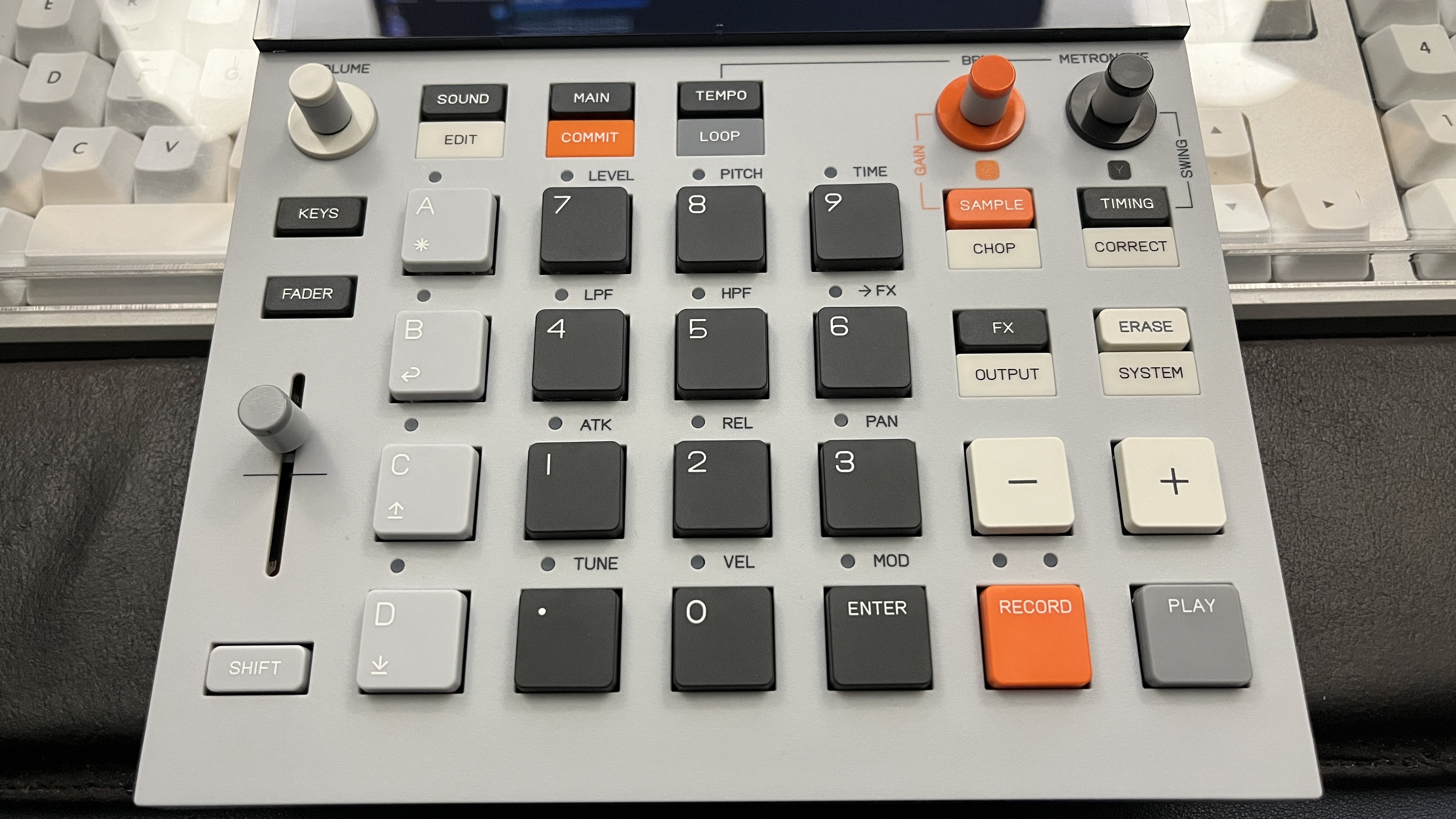 하단의 버튼들은 플라스틱으로 되어 있지만 누르는 느낌들이 굉장히 좋다. 공식 설명에는 기계식 키가 사용되었다고 하는데 그것 때문일 수도 있다. 상단에는 마스터 볼륨과 사운드 / 메인 / 템포 버튼과 X / Y 노브가 있다. 가장 자주 쓰게 될 노브들이다. 마스터 볼륨 밑에는 Keys와 Fader 버튼이 있어서 건반 모드로 전환하거나 페이더에 할당된 기능들을 바꿀 수 있다. 대부분의 공간을 차지하는 12개의 키는 샘플 연주를 한다거나 음악 뱅크를 바꾼다거나 값을 정확하게 입력하는 등 다양한 값을 입력할 수 있다. 하나의 키에 여러 가지 기능들이 들어가 있다는 점이 인상적이다. 우측에는 샘플 및 타이밍 기능 전환, FX, 노트 삭제 등의 기능과 레코드 및 재생 버튼이 있다. 있을 건 다 있다.
