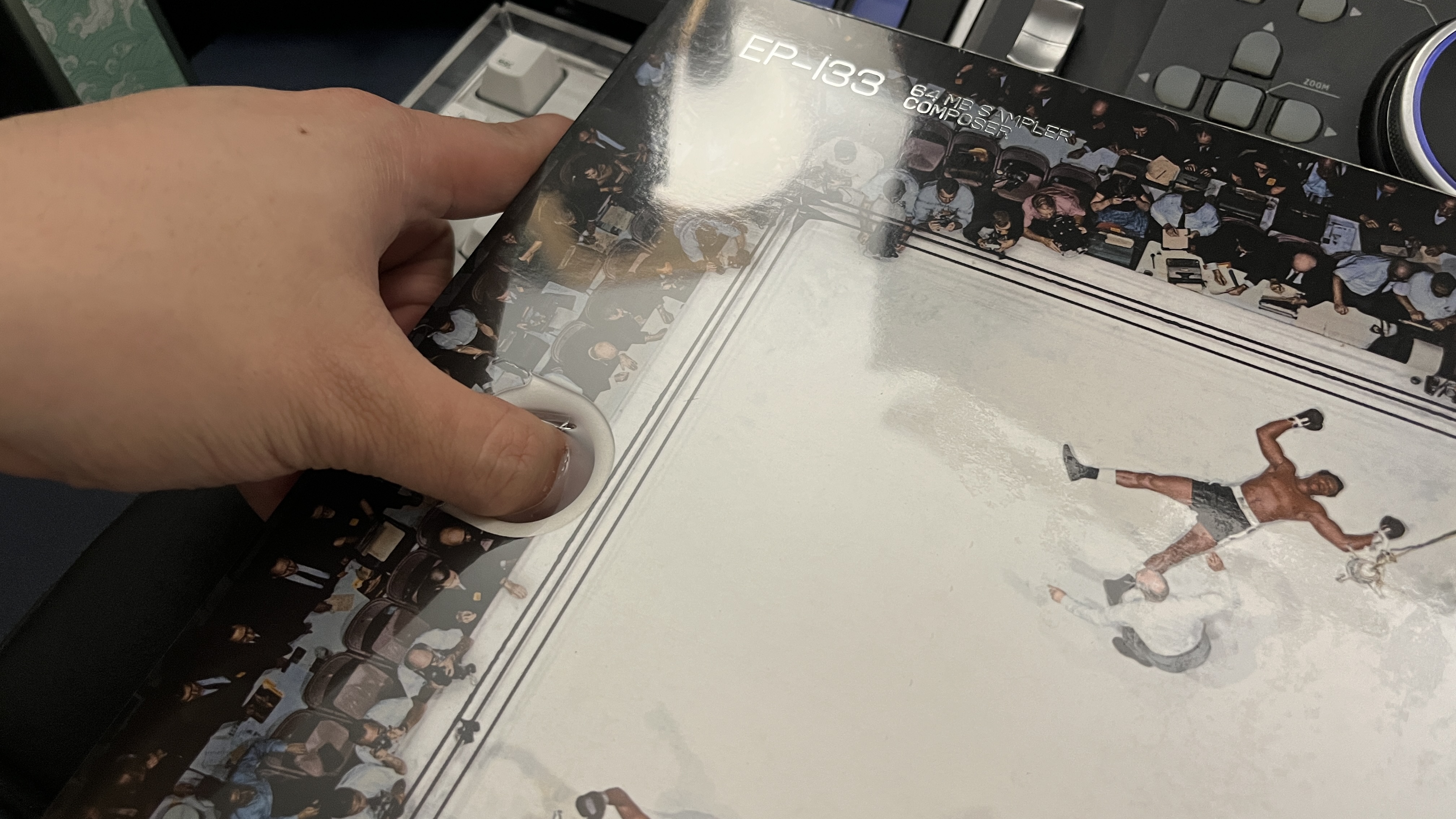 뒷면 역시 무하마드 알리의 제일 유명한 경기를 위에서 바라본 사진을 중심으로 EP-133 K.O II 로고와 TE 로고, 그리고 각종 인증 로고들이 모서리에 인쇄되어 있다. 패키지를 열 수 있는 손잡이도 여기에 있다. 하단에는 제품 시리얼 번호가 스티커로 붙여져 있다. 비닐 포장이 되어 있어서 새 제품이라는 인상이 확실하다.