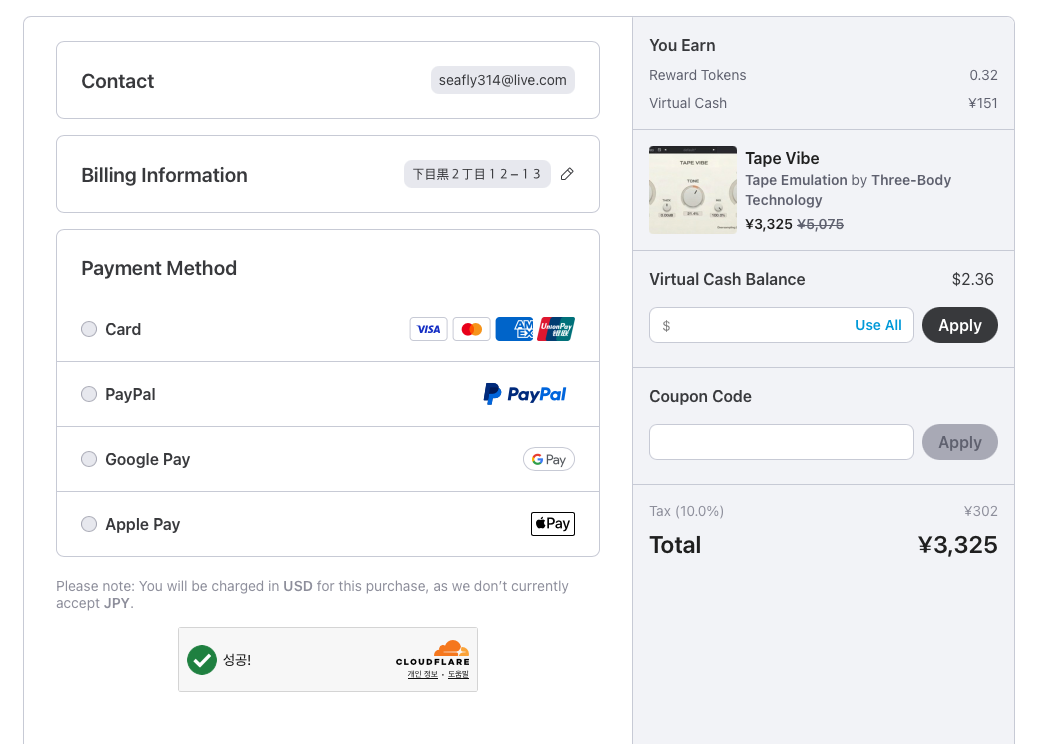 PluginBoutique는 최근 UI를 새롭게 단장했다. 홈페이지의 결제 버튼을 누르면 다음과 같은 새롭게 통합된 화면이 나타난다. 여기서는 구매 영수증을 받을 수 있는 이메일, 등록된 주소, 구매 그리고 이번 구매로 적립되는 캐시, 구매로 적립되는 토큰을 확인할 수 있다. 미리 주소나 이메일, 결제 수단 등을 확인하길 권장한다. 쿠폰 코드나 적립금 사용도 여기서 가능하다.