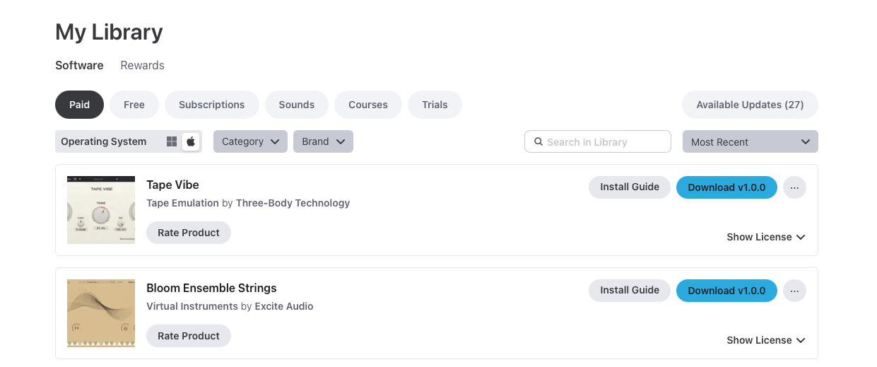 내 라이브러리에서는 지금까지 PluginBoutique를 통해 구입한 이펙터 및 가상 악기들의 시리얼 번호를 확인할 수 있다. 최상단에 필자가 구입한 Three-Body Technology Tape Vibe의 정보도 잘 표기되어 있다. 여기서 설치 파일 다운로드와 설치 시 주의사항 등을 확인할 수 있다. 만일 시리얼 대신 영문으로 긴 안내문이 표시되어 있다면 아직 전산상으로 시리얼 번호가 발급되지 않았다는 뜻이므로 조금 기다려야 한다. 이후에는 Installation Instruction을 따르자.