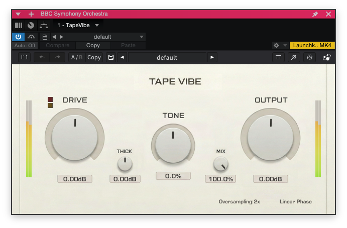 Three-Body Technology Tape Vibe를 실행하면 다음과 같은 5개의 노브가 나온다. 조작할 수 있는 기능이 크게는 3개, 디테일하게는 7개밖에 없는 굉장히 심플한 구성이다. 사용 방법도 매우 간단하다. Drive 노브로 테이프 새츄레이션을 더하고 Output 노브로 소리가 커진 만큼 줄이거나 올린다. Mix 값으로 Tape Vibe가 통과되는 정도를 디테일하게 조절할 수 있다. 만일 로우 / 로우-미드 대역대가 부족하다고 느껴지면 Thick으로 조절한다. Tone 노브를 조정하면 테이프 머신의 하이 대역의 롤오프를 재현할 수도 있다. 원한다면 오버샘플링 및 리니어 페이즈 설정도 할 수 있다. 굉장히 사용하기 쉽게 되어 있어 특별히 설명이 필요 없다.