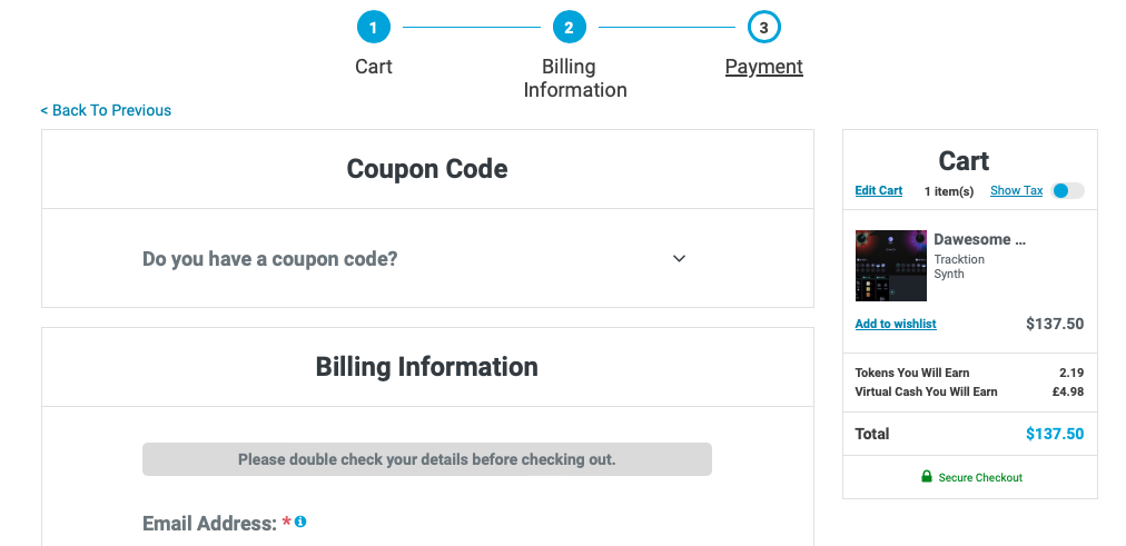 홈페이지 상단 우측에 자리 잡은 Cart를 누르면 다음과 같은 화면이 나타난다. 이 화면에서는 이번 구매로 적립되는 캐시, 구매로 적립되는 토큰을 확인할 수 있으며 상품 구매로 받을 수 있는 무료 선물을 선택할 수 있다. 만일 Plugin Boutique에서 처음 구매한다면 Claim Gift를 클릭해서 무료 선물을 받아가는 게 좋다. 플러그인 하나만 샀을 뿐인데 공짜로 다른 플러그인들도 가져갈 수 있다. 무료로 받을 수 있는 플러그인들은 기간에 따라 다르니 미리 구매 전에 어떤 걸 무료로 주는지 체크해 보는 것도 좋다. 모든 작업이 완료되었다면 초록색 "Secure Checkout"을 눌러 다음 화면으로 넘어가자.