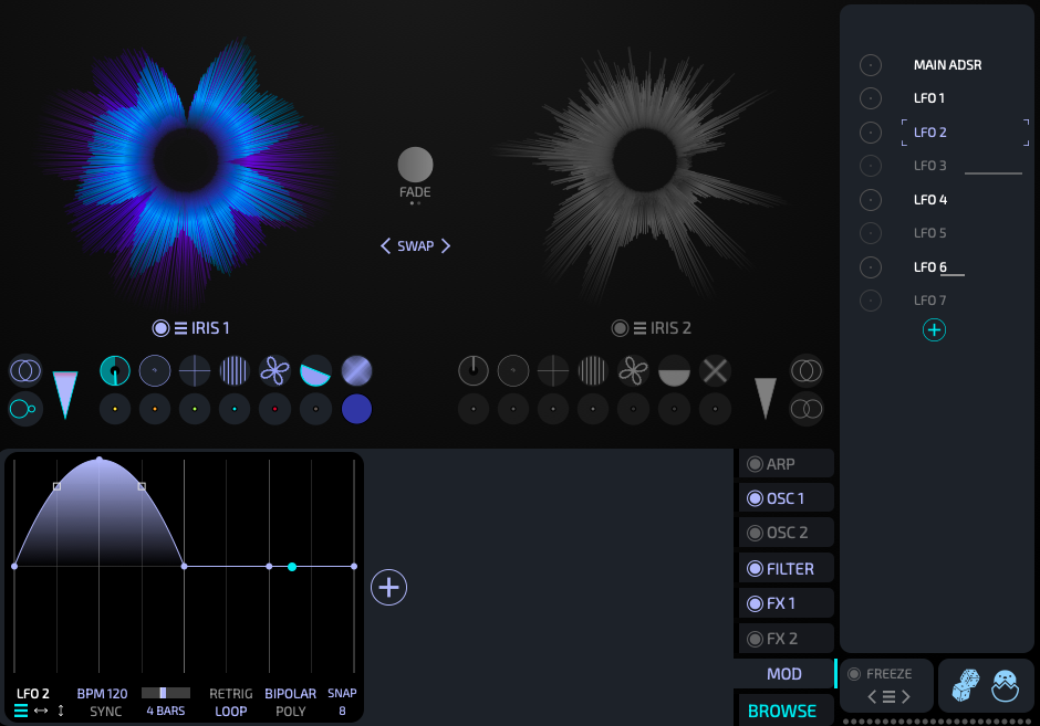 IRIS 모듈 하단에는 오실레이터들과 필터, 그리고 FX 설정, 아르폐지에이터 모듈이 있다. 모듈들은 처음부터 정해져 있지 않기에 직접 하나씩 추가해 가며 사용하는 형태다, 각각에 모듈들에 모듈레이션을 걸 수도 있고, 또한 매크로로 묶어서 별도 조작도 가능하다. 하드웨어 신디사이저의 느낌을 디지털로 옮겼다는 느낌이 뭔지 알 듯하다. 다만 그 신디사이저가 일반적인 올인원 신디사이저가 아닌 모듈러 신디사이저라는 점에서 차이가 있지만.