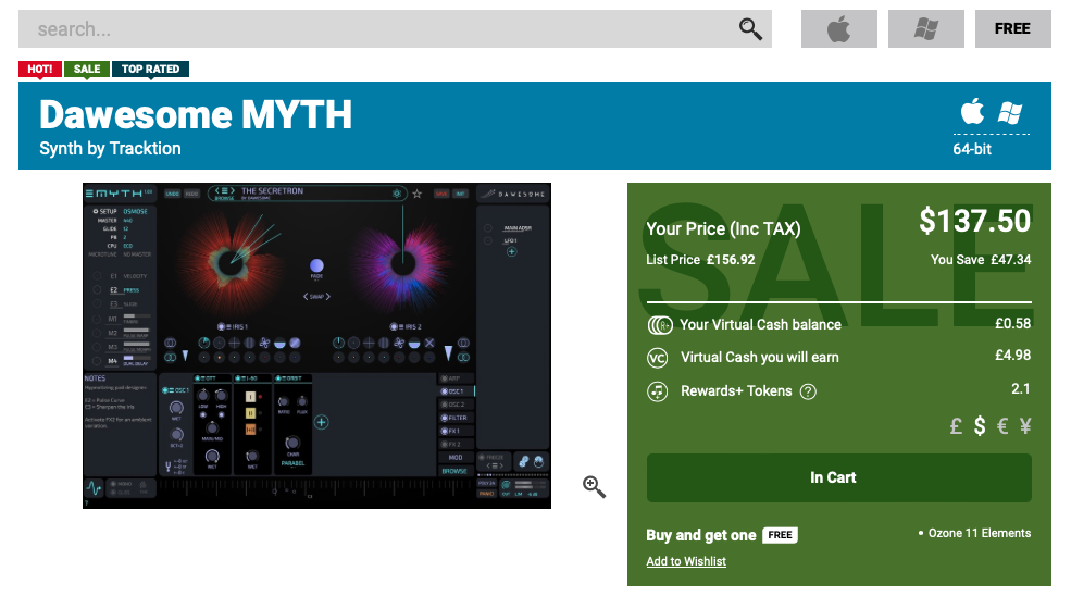 Tracktion DAWESOME Myth 구매 링크 (PluginBoutique)를 클릭하거나, Plugin Boutique(링크)에 접속한 후, 검색창에 " DAWESOME Myth"를 검색하면 위와 같은 화면이 나타난다. Plugin Boutique는 회원 가입을 하지 않아도 상품 구매가 가능하지만, 회원 가입을 하는 편이 추후 라이센스 관리에 용이하다. 기본값은 파운드화로 나타나지만 달러나 엔, 유로화로 가격을 바꿔가며 확인할 수 있다. 다만, 대한민국 원은 지원하지 않으므로 해외 결제가 지원되는 카드나 페이팔 계정을 미리 준비할 필요가 있다. Add to Cart를 클릭하여 상품을 내 장바구니로 담자.