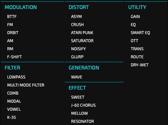 사용할 수 있는 모듈들은 위의 사진과 같다. 대부분의 신디사이저에 들어가 있는 모듈레이션과 빈티지 신디사이저에 들어가 있는 이펙트, 웨이브폼, 거기에 최신 신디사이저에 차용되기 시작힌 OTT 모듈까지 프로세싱에 필요한 기능들은 대부분 들어가 있다. 필요한 목적에 따라 적당히 걸고 사용하면 된다.