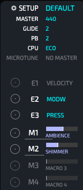 그 밖에도 DAWESOME Myth의 매크로 노브라던가 애프터 터치, 벨로시티 등의 기능들은 좌측 상단의 모듈에서 확인할 수 있다. 또한 기본적인 셋업도 여기서 진행할 수 있다. 기초 주파수를 조절할 수도 있고, 글라이드 정도, 피치 벤딩, CPU 설정 등 음악 작업에 있어 필수적인 기능들을 바로 조작할 수 있다.