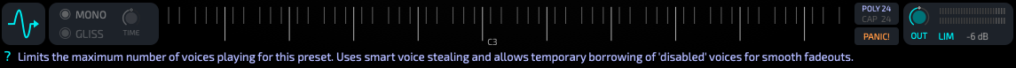 하단에는 현재 플레이되는 노트의 음계와 신디사이저 설정들 일부가 배치되어 있다. 폴리포닉으로 할 것인지, 모노에 글라이드 옵션을 넣을 것인지 등 다양한 옵션들이 배치되어 있다. 노트 음계가 조금 이상하게 배치되어 있다고 느낄 수도 있는데, DAWESOME Myth가 MPE를 지원하기 때문이다. 그렇기에 음계 배치도 MPE에 맞게 디자인되어 있다. 덤으로 아웃풋 설정도 여기서 할 수 있는데, 레벨 및 리미터 여부를 여기서 설정할 수 있다.