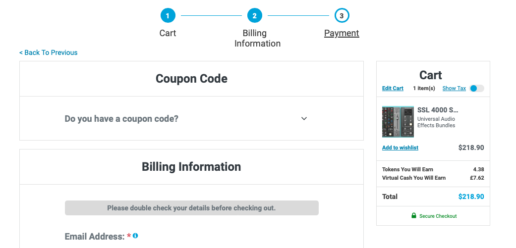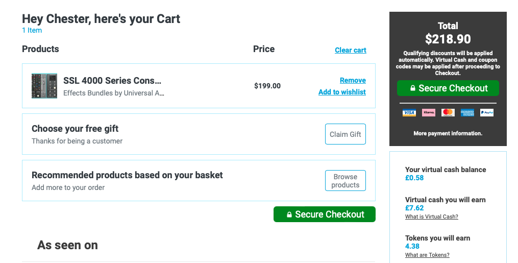 홈페이지 상단 우측에 자리 잡은 Cart를 누르면 다음과 같은 화면이 나타난다. 이 화면에서는 이번 구매로 적립되는 캐시, 구매로 적립되는 토큰을 확인할 수 있으며 상품 구매로 받을 수 있는 무료 선물을 선택할 수 있다. 만일 Plugin Boutique에서 처음 구매한다면 Claim Gift를 클릭해서 무료 선물을 받아가는 게 좋다. 플러그인 하나만 샀을 뿐인데 공짜로 다른 플러그인들도 가져갈 수 있다. 무료로 받을 수 있는 플러그인들은 기간에 따라 다르니 미리 구매 전에 어떤 걸 무료로 주는지 체크해 보는 것도 좋다. 모든 작업이 완료되었다면 초록색 "Secure Checkout"을 눌러 다음 화면으로 넘어가자.