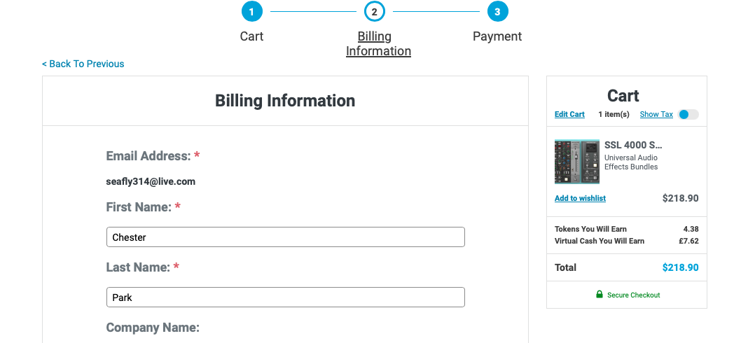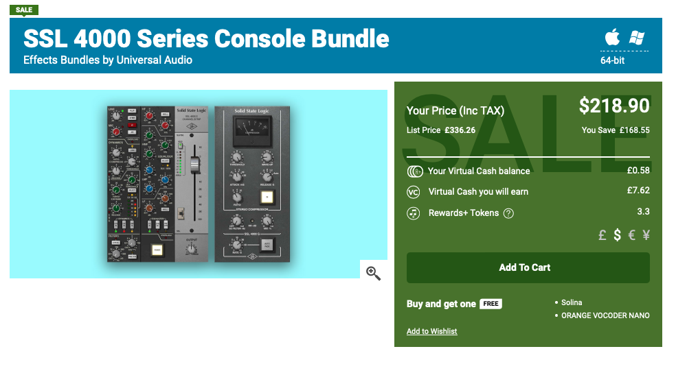 Univerasl Audio SSL 4000 Series Console Bundle 구매 링크 (PluginBoutique)를 클릭하거나, Plugin Boutique(링크)에 접속한 후, 검색창에 "Universal Audio SSL 4000 Series Console Bundle"를 검색하면 위와 같은 화면이 나타난다. Plugin Boutique는 회원 가입을 하지 않아도 상품 구매가 가능하지만, 회원 가입을 하는 편이 추후 라이센스 관리에 용이하다. 기본값은 파운드화로 나타나지만 달러나 엔, 유로화로 가격을 바꿔가며 확인할 수 있다. 다만, 대한민국 원은 지원하지 않으므로 해외 결제가 지원되는 카드나 페이팔 계정을 미리 준비할 필요가 있다. Add to Cart를 클릭하여 상품을 내 장바구니로 담자.