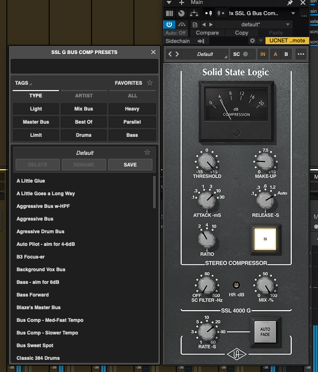 만일 어떤 방향으로 G Comp를 사용해야 할지 어렵다고 느낀다면 적극적으로 프리셋을 사용해 보자. UADx SSL G Bus Compressor에는 다른 UADx 악기 이펙터와 마친가지로 프리셋 브라우저 및 A/B 설정 전환 모드가 있어 원하는 프리셋을 한 번의 클릭으로 비교할 수 있다. 내장되어 있는 프리셋 윈도우는 프리셋 별 Type 및 프리셋을 만든 아티스트별로 모아서 볼 수 있는데, 기능이 꽤 막강하다. 마음에 드는 프리셋에 "Favorite" 표시를 할 수 있어 나중에 마음에 든 프리셋을 모아서 따로 볼 수 있다.