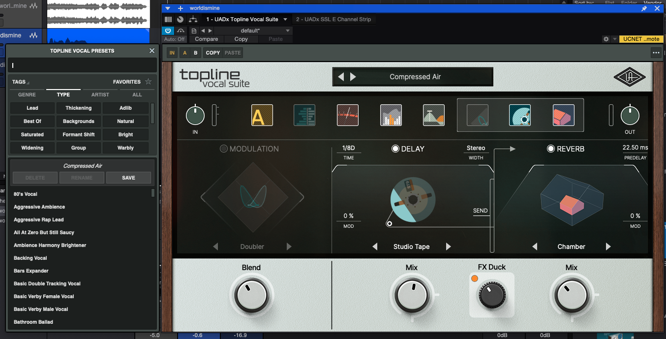 Topline Vocal Suite를 써보고 싶은데 기능이 너무 많은 것 같아 조작하기 어렵다면 프리셋을 사용해 보자. Topline Vocal Suite에는 다른 UADx 악기 이펙터와 마친가지로 프리셋 브라우저 및 A/B 설정 전환 모드가 있어 원하는 프리셋을 한 번의 클릭으로 비교할 수 있다. 내장되어 있는 프리셋 윈도우는 프리셋 별 Type 및 프리셋을 만든 아티스트별로 모아서 볼 수 있는데, 기능이 꽤 막강하다. 마음에 드는 프리셋에 "Favorite" 표시를 할 수 있어 나중에 마음에 든 프리셋을 모아서 따로 볼 수 있다.