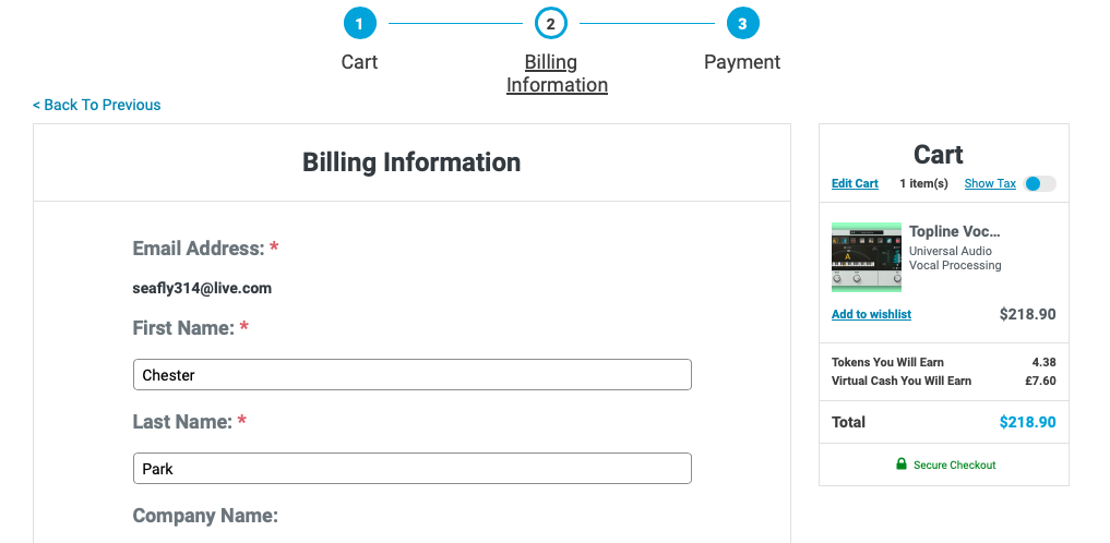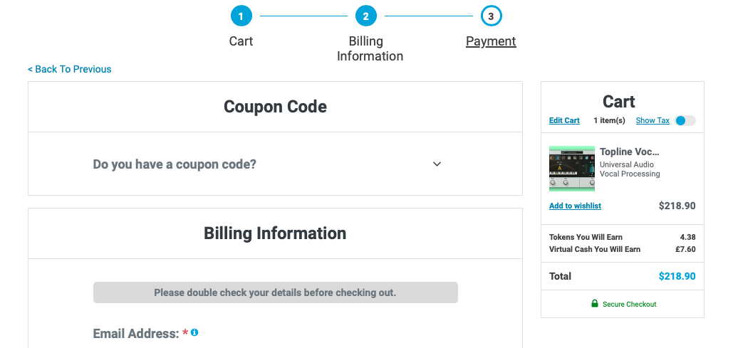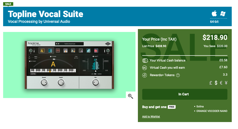 UAD Topline Vocal Suite 구매 링크 (PluginBoutique)를 클릭하거나, Plugin Boutique(링크)에 접속한 후, 검색창에 "Topline Vocal Suite"를 검색하면 위와 같은 화면이 나타난다. Plugin Boutique는 회원 가입을 하지 않아도 상품 구매가 가능하지만, 회원 가입을 하는 편이 추후 라이센스 관리에 용이하다. 기본값은 파운드화로 나타나지만 달러나 엔, 유로화로 가격을 바꿔가며 확인할 수 있다. 다만, 대한민국 원은 지원하지 않으므로 해외 결제가 지원되는 카드나 페이팔 계정을 미리 준비할 필요가 있다. Add to Cart를 클릭하여 상품을 내 장바구니로 담자.