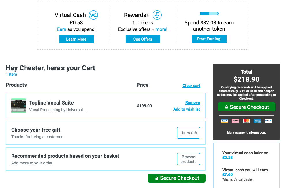 홈페이지 상단 우측에 자리 잡은 Cart를 누르면 다음과 같은 화면이 나타난다. 이 화면에서는 이번 구매로 적립되는 캐시, 구매로 적립되는 토큰을 확인할 수 있으며 상품 구매로 받을 수 있는 무료 선물을 선택할 수 있다. 만일 Plugin Boutique에서 처음 구매한다면 Claim Gift를 클릭해서 무료 선물을 받아가는 게 좋다. 플러그인 하나만 샀을 뿐인데 공짜로 다른 플러그인들도 가져갈 수 있다. 무료로 받을 수 있는 플러그인들은 기간에 따라 다르니 미리 구매 전에 어떤 걸 무료로 주는지 체크해 보는 것도 좋다. 모든 작업이 완료되었다면 초록색 "Secure Checkout"을 눌러 다음 화면으로 넘어가자.