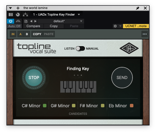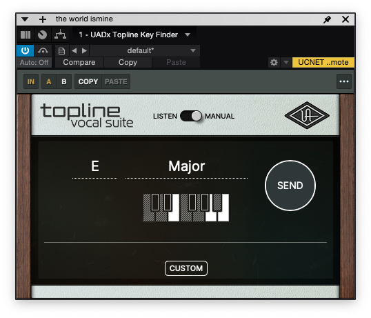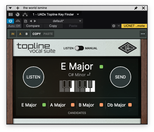 가장 먼저 별로 중요해 보이지 않아 보이는 Topline Key Finder를 먼저 살펴보도록 하자. 이름대로 Inst 트랙의 키를 감지해 값을 Topline Vocal Suite로 보내는 기능을 가지고 있다. 만일 Auto-Tune 사의 Auto-Key 같은 프로그램을 써본 적이 있다면 거의 작동 방법이 유사하다. 다만 디테일적인 부분에서 UAD 오디오 인터페이스 느낌이 나는 나무 프레임 같은 게 붙어 있어 조금 더 아날로그틱하단 인상이다.