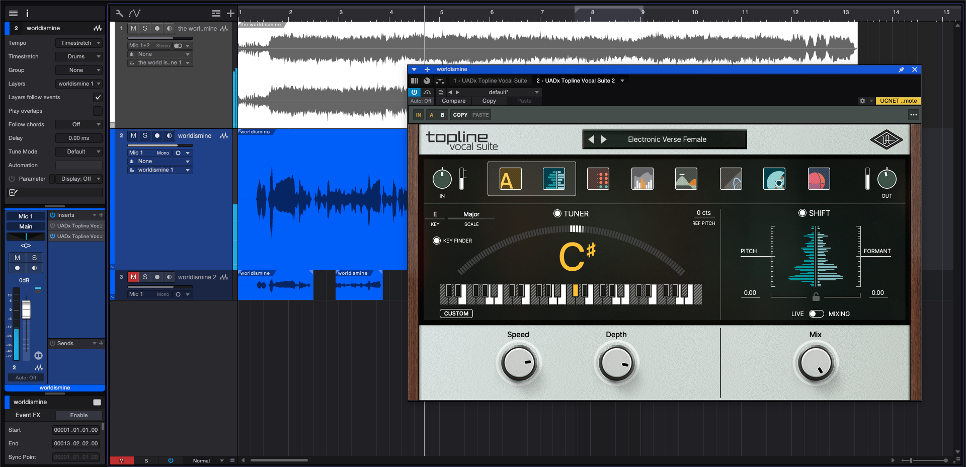 Topline Key Finder를 살펴봤으니 본체, Topline Vocal Suite를 살펴볼 때가 왔다. Key Finder와 마찬가지로 테두리의 목제 느낌이 아날로그 한 느낌을 준다. 오디오 인터페이스 Volt의 느낌도 나는 듯하다. 처음 이펙터를 켜게 되면 튜너 및 피치 쉬프트가 먼저 반겨준다. Key Finder에서 보냈던 Key가 여기서 활용되는데, Tuner에 반영된다. 물론 Key Finder에서 설정했던 Key를 안 쓸 수도 있다. Auto-Tune처럼 자동으로 교정해 주는 형태인데, 하단의 Speed와 Depth로 값을 조절한다. 조작법이 간편하지만 Melodyne 같은 디테일하게 편집은 불가능하다. 실시간으로 조정되는 형태라는 점에서 Waves Tune Live와도 비슷한 느낌이다.