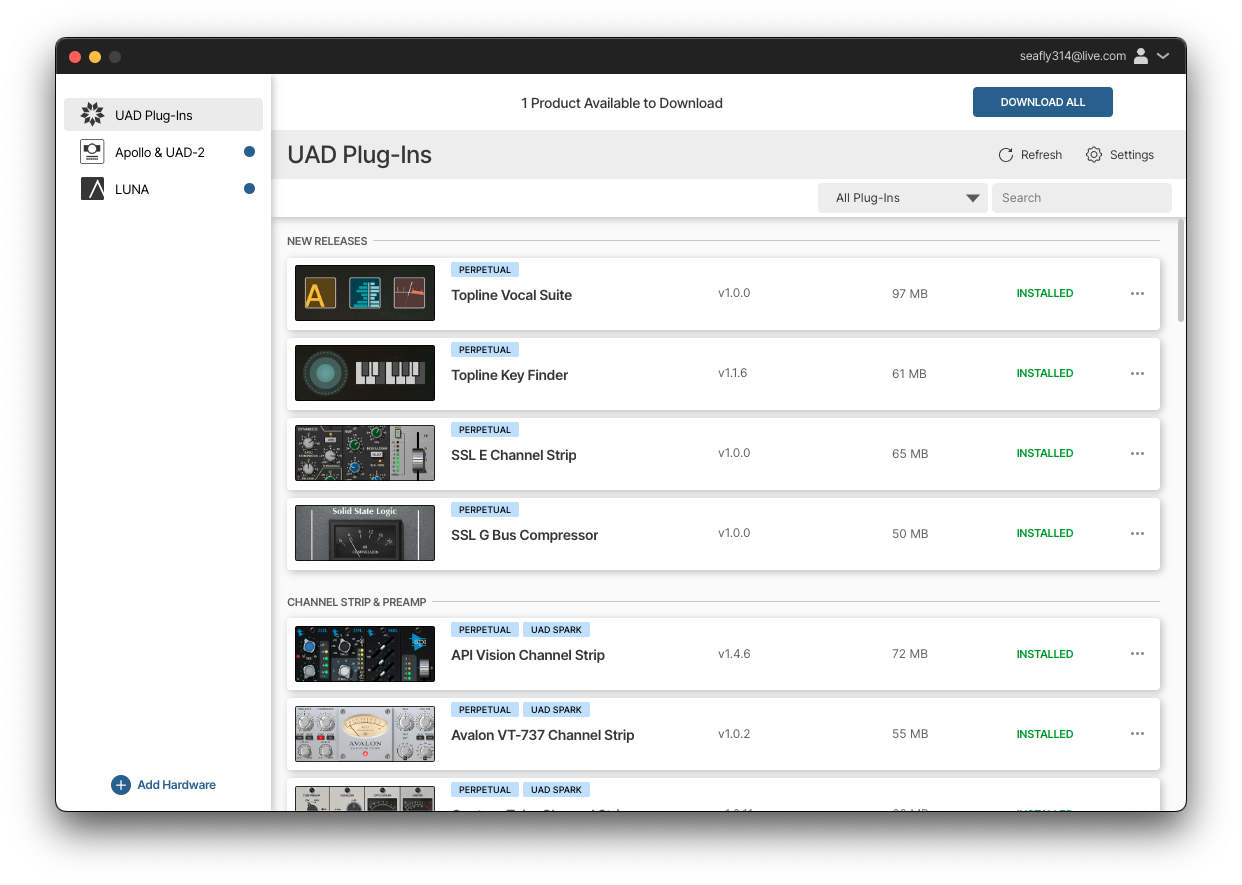 Universal Audio의 Native 플러그인들은 "UA Connect"라 불리는 별도의 프로그램에서 관리된다. UA Connect에서는 iLok과 연동되어 자동으로 라이센스 등록 및 플러그인 설치도 할 수 있기에 반드시 설치하는 걸 권장한다. UA Connect를 실행한 다음, 오늘의 주인공, Topline Vocal Suite를 ILok 계정에 인증하고, 설치한다. 플러그인 인증에는 iLok 계정이 필요하므로 미리 만들어 놓는 걸 추천한다. 필자의 계정은 현재 베타 테스트를 진행 중이므로 일반적인 UA Connect 화면과 다를 수 있다.