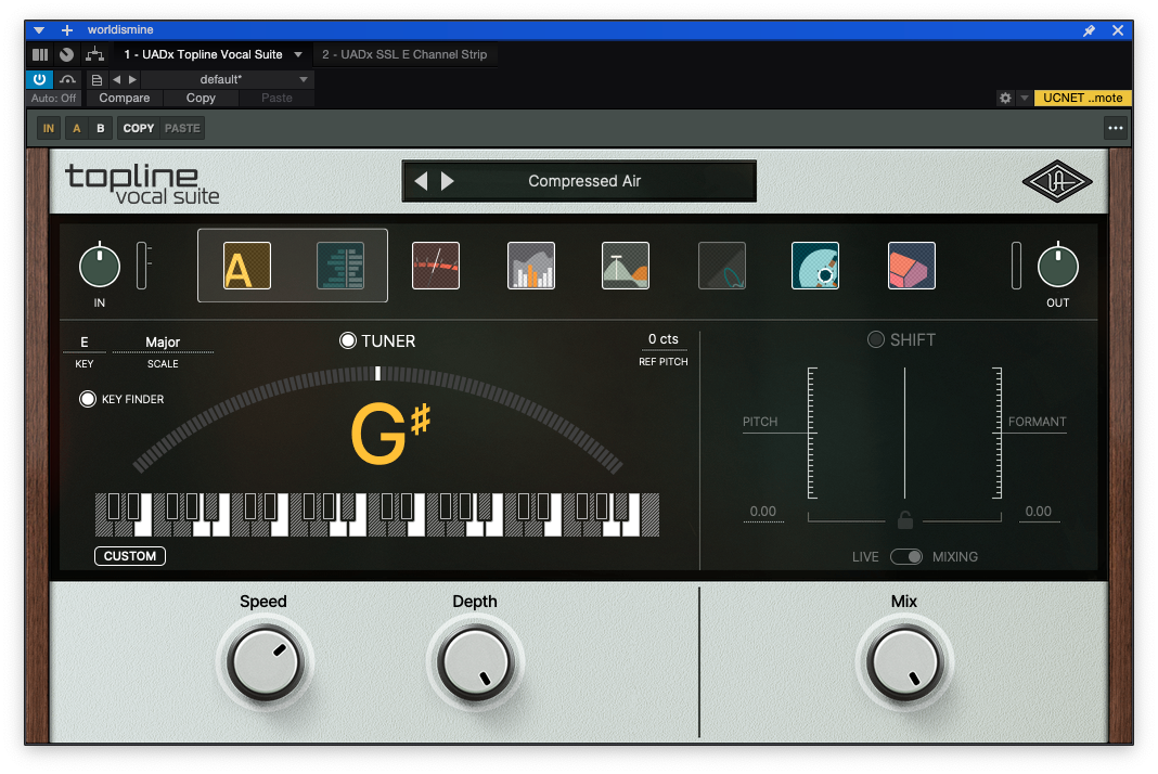 Topline Key Finder를 살펴봤으니 본체, Topline Vocal Suite를 살펴볼 때가 왔다. Key Finder와 마찬가지로 테두리의 목제 느낌이 아날로그 한 느낌을 준다. 오디오 인터페이스 Volt의 느낌도 나는 듯하다. 처음 이펙터를 켜게 되면 튜너 및 피치 쉬프트가 먼저 반겨준다. Key Finder에서 보냈던 Key가 여기서 활용되는데, Tuner에 반영된다. 물론 Key Finder에서 설정했던 Key를 안 쓸 수도 있다. Auto-Tune처럼 자동으로 교정해 주는 형태인데, 하단의 Speed와 Depth로 값을 조절한다. 조작법이 간편하지만 Melodyne 같은 디테일하게 편집은 불가능하다. 실시간으로 조정되는 형태라는 점에서 Waves Tune Live와도 비슷한 느낌이다.
