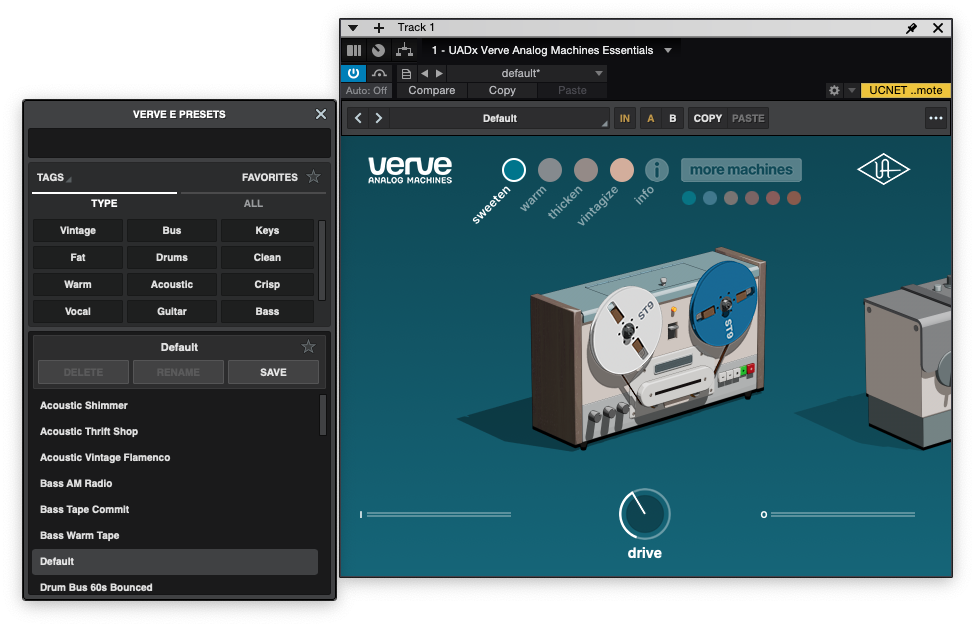 반면 UAD Verve Analog Machines은 조금 더 기능이 많다. 아웃풋 출력 레벨도 설정할 수 있고, 사용할 수 있는 머신의 수도 10가지로 늘었고, 각 머신별로 사용할 수 있는 기능이 하나 더 추가되었다. 예시로, 지금 보고 있는 Sweeten의 경우 테이프 머신이라 Warble이라 불리는 노브가 추가되어 있는데, 이는 테잎 머신의 특징 중 하나인 Wow&Flutter를 조절할 수 있다. 크게 돌릴수록 Wow&Flutter가 강해진다. 로우-파이 하기에 좋은 사운드가 나온다.