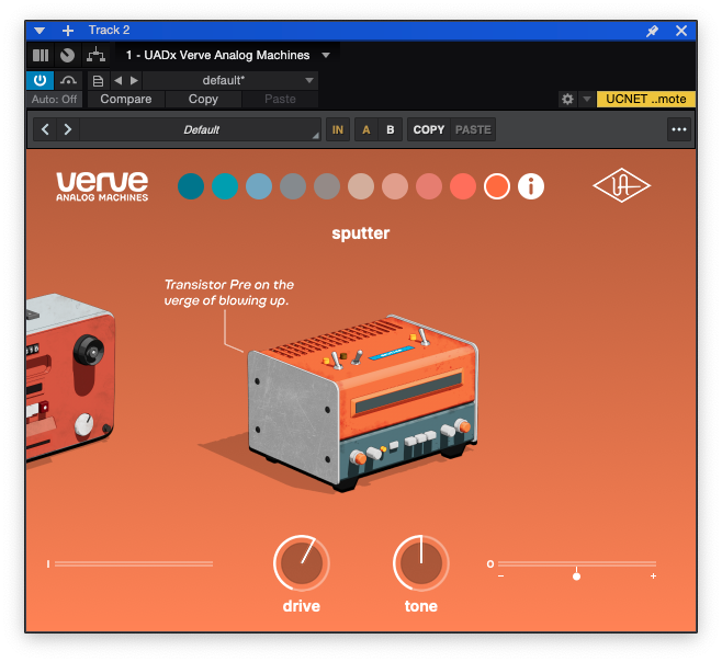 다음은 앰프 머신 중 하나인 Sputter의 모습이다. 앰프 머신은 테잎 머신과 달리 Tone 노브가 추가된 게 보이는데, 양에 따라 소리의 느낌이 달라진다. UAD Verve Analog Machines의 머신들은 크게 테잎 머신 아니면 앰프 머신이기에 사진에서 본 것처럼 벗어나는 기능은 없다고 봐도 무방하다.