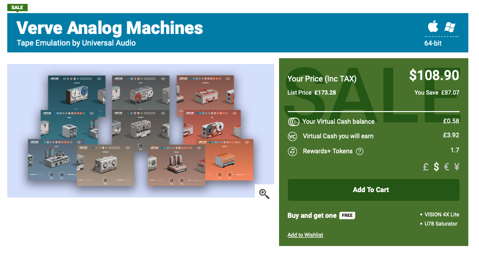 UAD Verve Analog Machines 구매 링크 (PluginBoutique)를 클릭하거나, Plugin Boutique(링크)에 접속한 후, 검색창에 "UAD Verve Analog Machines"를 검색하면 위와 같은 화면이 나타난다. Plugin Boutique는 회원 가입을 하지 않아도 상품 구매가 가능하지만, 회원 가입을 하는 편이 추후 라이센스 관리에 용이하다. 기본값은 파운드화로 나타나지만 달러나 엔, 유로화로 가격을 바꿔가며 확인할 수 있다. 다만, 대한민국 원은 지원하지 않으므로 해외 결제가 지원되는 카드나 페이팔 계정을 미리 준비할 필요가 있다. Add to Cart를 클릭하여 상품을 내 장바구니로 담자.