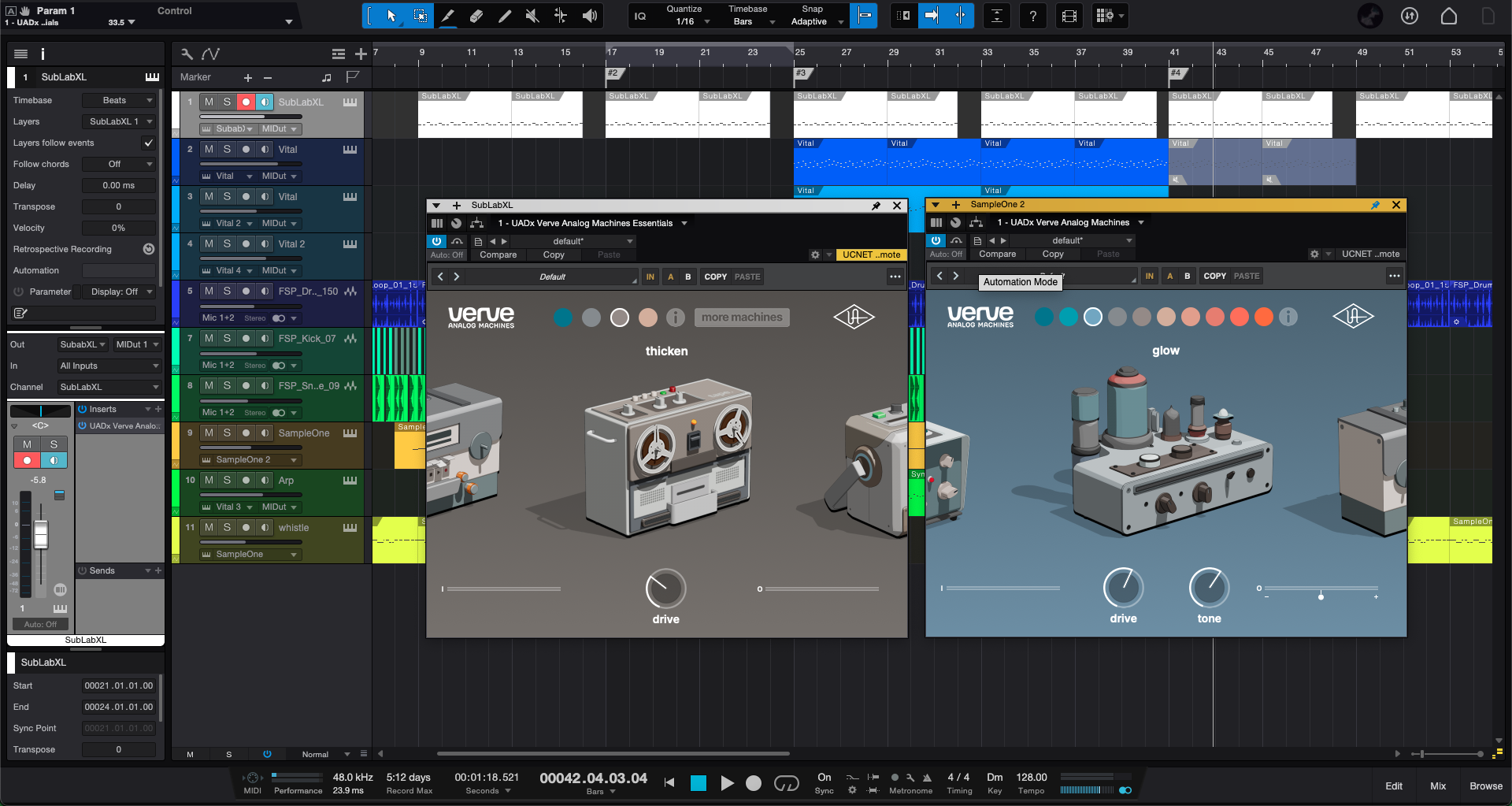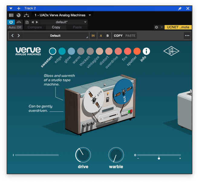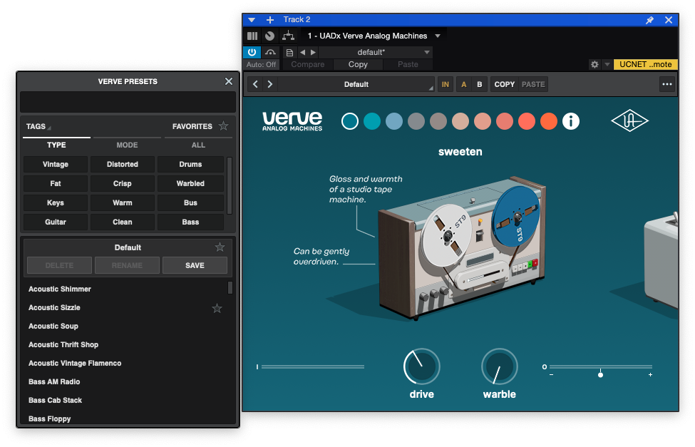 반면 UAD Verve Analog Machines은 조금 더 기능이 많다. 아웃풋 출력 레벨도 설정할 수 있고, 사용할 수 있는 머신의 수도 10가지로 늘었고, 각 머신별로 사용할 수 있는 기능이 하나 더 추가되었다. 예시로, 지금 보고 있는 Sweeten의 경우 테이프 머신이라 Warble이라 불리는 노브가 추가되어 있는데, 이는 테잎 머신의 특징 중 하나인 Wow&Flutter를 조절할 수 있다. 크게 돌릴수록 Wow&Flutter가 강해진다. 로우-파이 하기에 좋은 사운드가 나온다.