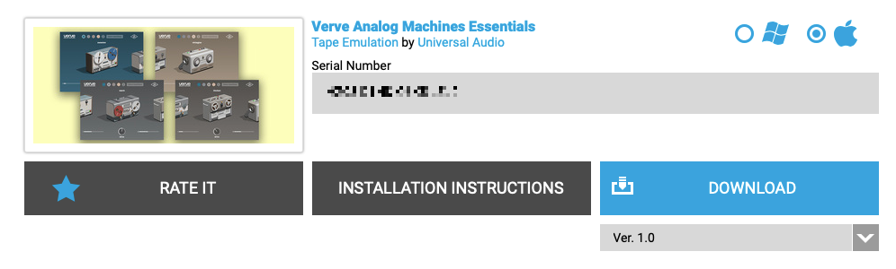 결제가 끝난 후, 상단의 "My Account"를 클릭하면 방금 전에 구매한 UAD Verve Analog Machines의 시리얼 번호가 표시되어 있다. 여기서 설치 파일 다운로드와 설치 시 주의사항 등을 확인할 수 있다. 만일 시리얼 대신 영문으로 긴 안내문이 표시되어 있다면 아직 전산상으로 시리얼 번호가 발급되지 않았다는 뜻이므로 조금 기다려야 한다. 이후 설정은 하단의 사이트에서 진행된다. 등록을 위해 Universal Audio 계정이 필요하니 미리 준비하자.