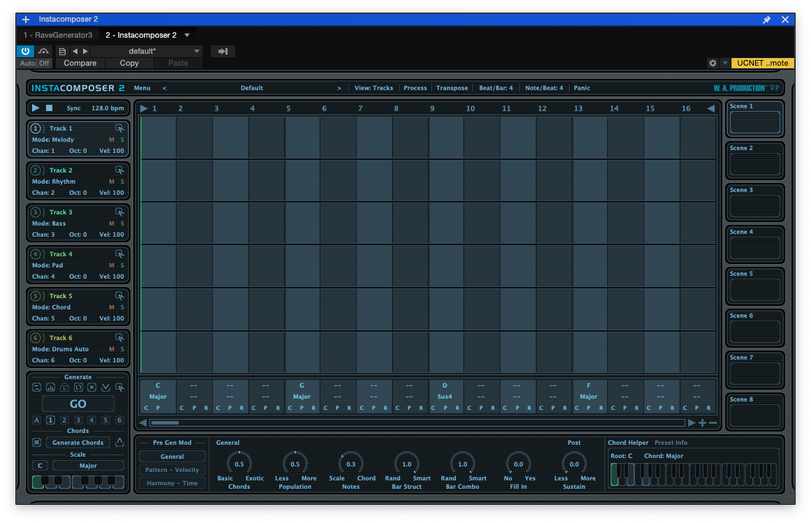 W.A. Production InstaComposer 2를 처음 실행하면 왠지 DAW 비스므리한 화면이 나타났다. 이제 이 화면에서 코드라던가 멜로디 등을 맘대로 만들어내면 된다. 자세한 기능들은 하단에서 심도 깊게 살펴보도록 하겠다.