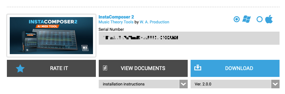 라이센스 등록이 마무리되었다면 이제 InstaComposer 2의 진짜 시리얼 키를 확인할 차레다. 확인 후, 어딘가 확인할 수 있는 메모장 같은 곳에 복사한 뒤에, 설치 파일을 다운로드하자. 설치 파일은 개인 페이지 및 로그인을 한 후에 W.A. Production 제품 페이지에서도 다운로드 받을 수 있다.
