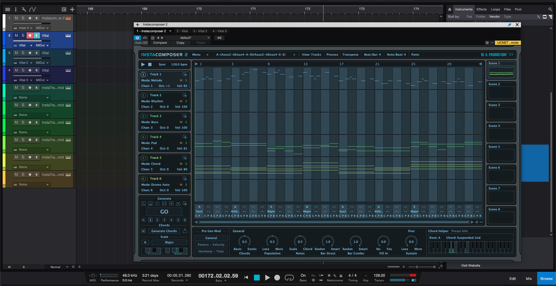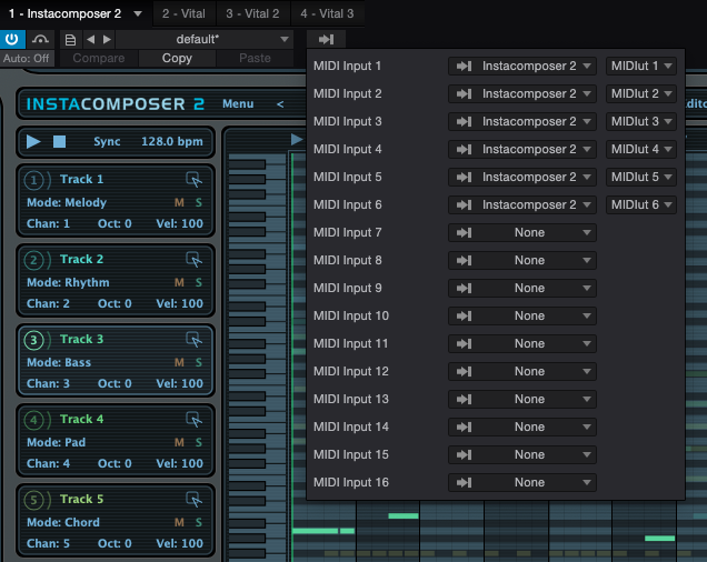 그 다음, 자동으로 연주하고 싶은 악기로 가서 어떤 트랙들을 연주하게 할 건지 사진과 같이 설정을 한다. 필자는 Vital에 코드 트랙을 연주하게끔 만들고 싶었기에 InstaComposer 2 - MIDI Output 5를 선택했다. 이후 재생을 하게 되면 자동으로 InstaComposer 2에 찍힌 멜로디대로 노트가 연주되게 된다. 다른 DAW들의 경우는 잘 모르기에 한번 검색해 보는 걸 권한다.