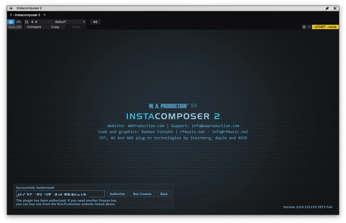 InstaComposer 2를 설치한 후 자동으로 상단과 같은 이미지가 나타난다. 좌측 하단에 W.A. Production에서 발급받은 시리얼 번호를 입력 후 "Authorize" 버튼을 누르면 된다.