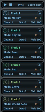 바로 하단에는 미디 트랙을 만들어주는 제너레이터 모듈이 있다. 좌측 상단에 다양한 기능들이 작은 아이콘으로 표시되고 있는데 마우스 커서를 가까히 가져다 대면 어떤 기능들이 있는지 한눈에 확인할 수 있다. 좌측부터 "현재 멜로디 기반으로 다양한 바리에이션 만들기", "현재 노트들의 벨로시티 랜덤화", "모든 트랙들을 링크 컨트롤하기", "컨트롤 리셋(링크되었다면 그 트랙도 포함)", 모든 트랙 노트 지우기", "미디 파일로 저장하기", "가지고 있는 미디 파일 드래그 드랍하기"다. 멜로디 및 코드, 베이스를 만들어낼 때 꽤 요긴하게 사용할 수 있는 기능들이다. 특히 벨로시티 랜덤화는 멜로디나 코드 쪽에 사용하면 좋을 듯하다.