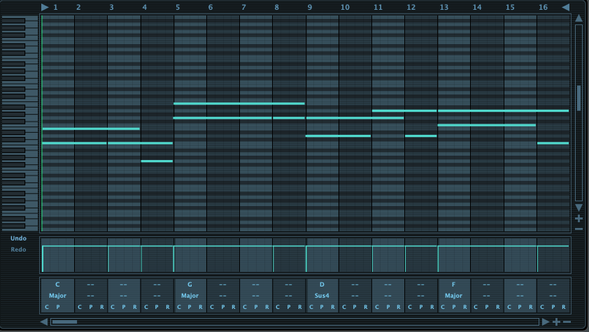 이제 하단의 코드 부분에도 변화가 약간 생긴 걸 확인할 수 있는데, C, P, R의 글자가 바뀌었다. C, P, R의 뜻은 카피, 붙여넣기, 이전 코드 반복하기의 약자다. 즉, C G D F 부분의 코드 부분을 더욱 세분화해서 멜로디를 만들 수 있다. 그것도 자동으로.