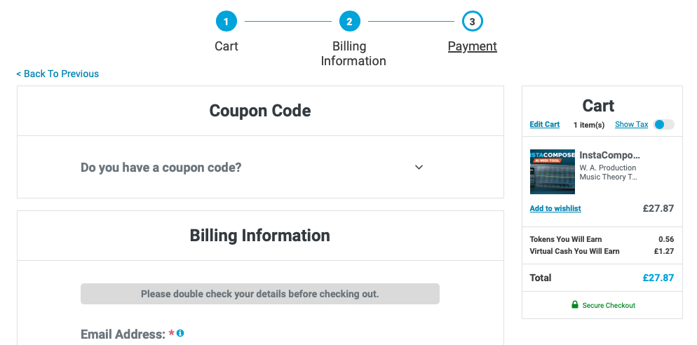홈페이지 상단 우측에 자리 잡은 Cart를 누르면 다음과 같은 화면이 나타난다. 이 화면에서는 이번 구매로 적립되는 캐시, 구매로 적립되는 토큰을 확인할 수 있으며 상품 구매로 받을 수 있는 무료 선물을 선택할 수 있다. 만일 Plugin Boutique에서 처음 구매한다면 Claim Gift를 클릭해서 무료 선물을 받아가는 게 좋다. 플러그인 하나만 샀을 뿐인데 공짜로 다른 플러그인들도 가져갈 수 있다. 무료로 받을 수 있는 플러그인들은 기간에 따라 다르니 미리 구매 전에 어떤 걸 무료로 주는지 체크해 보는 것도 좋다. 모든 작업이 완료되었다면 초록색 "Secure Checkout"을 눌러 다음 화면으로 넘어가자.