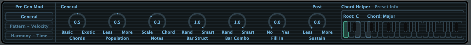 어레인지 뷰 바로 아래에는 미디 노트들을 생성할 때 어떻게 노트들을 만들어낼 것인지 설정할 수 있는 프리-제너레이터 모듈레이션이 있다. 기본적으로 3가지의 모드를 제공해 주는데, 각각 기능에 따라 세부적으로 조절 가능한 것들이 많다. 일반 모드를 예로 들자면 코드의 다양성이나 멜로디 쪽의 유명성, 노트가 스케일을 따라갈지, 코드를 따라갈지, 랜덤 하게 구성할지, 필인 요서를 넣을지, 서스테인 요소를 넣을지 등 다양한 기능들이 있다. 패턴 - 벨로시티 모드는 또 다른 요소들 편집이, 하모니 - 시간 모드 또한 다른 요소 편집이 가능하다.