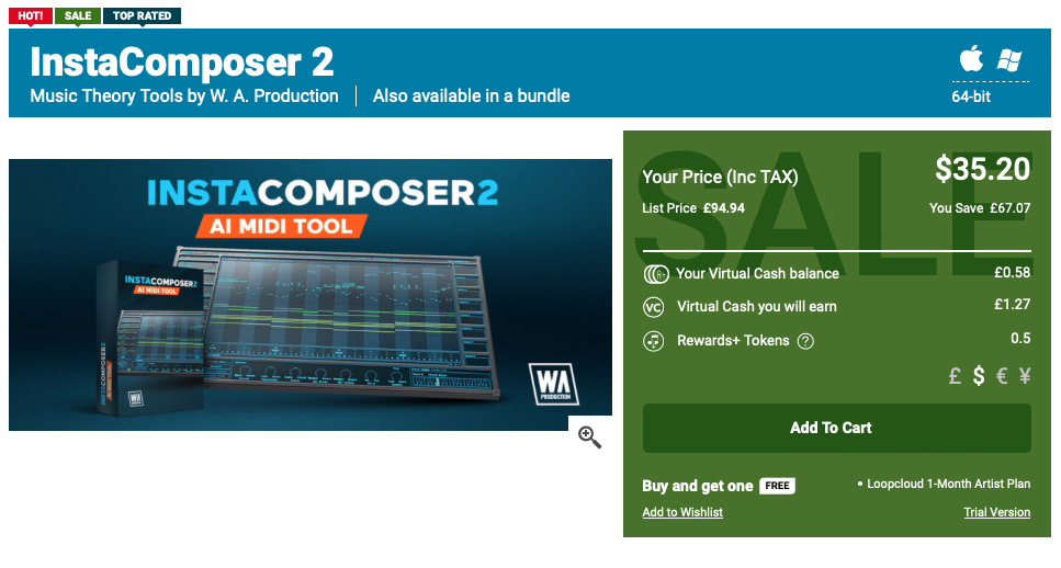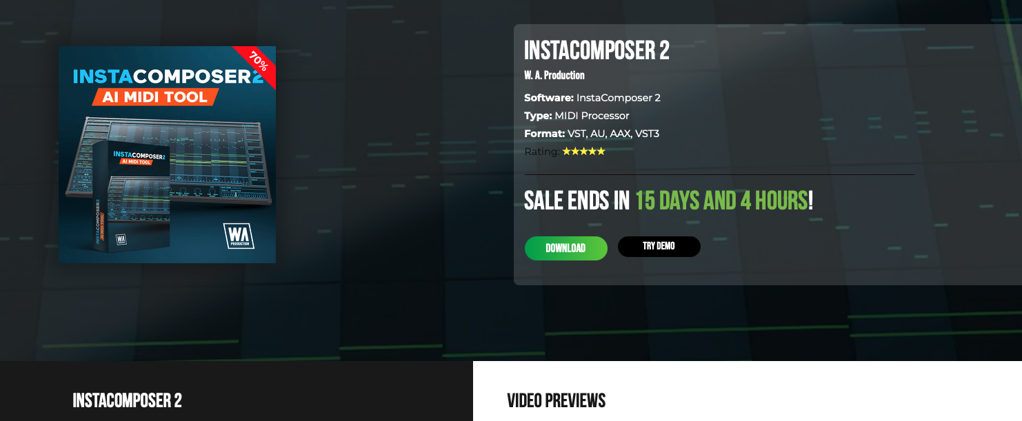 InstaComposer 2를 개발한 W.A. Production은 약간 생소하다. 샘플팩에서 이름을 본 거 같은데 그렇게 존재감이 강한 회사는 아니다. 그런데, W.A. Production, 꽤 여러가지 활동들을 하고 있다. 플러그인 개발뿐만 아니라 샘플팩 개발부터 데모 프로젝트 판매, 교육 비디오까지 음악 제작에 꽤 진심이다. InstaComposer 2는 W.A. Production의 가장 최신작이다. 설명에 따르면 MIDI 제작 시 창의력이 고갈될 때를 대비한 MIDI 생성 플러그인이라고 한다. InstaComposer 1도 있었는데 AI 기술력이 접목되면서 보다 창의적인 멜로디 및 코드를 추천해준다고 한다. 가격은 정가 기준 109$지만 할인을 자주 하기 때문에 32.7$라는 생각보다 저렴한 가격에 만나볼 수 있다. 멜로디 및 코드를 만들어 주는데 이렇게 저렴한 가격이라니! 또 흥미로운 플러그인의 등장이다.