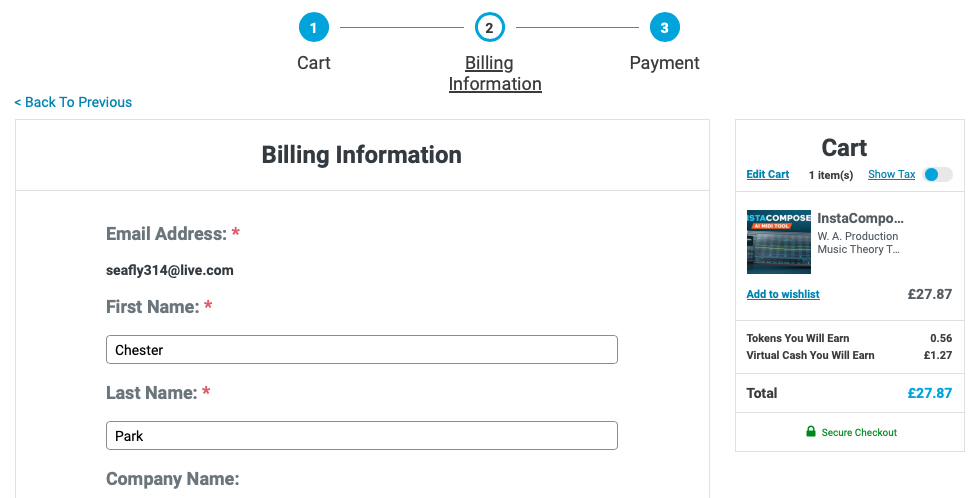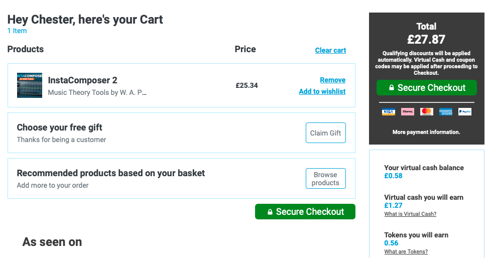 홈페이지 상단 우측에 자리 잡은 Cart를 누르면 다음과 같은 화면이 나타난다. 이 화면에서는 이번 구매로 적립되는 캐시, 구매로 적립되는 토큰을 확인할 수 있으며 상품 구매로 받을 수 있는 무료 선물을 선택할 수 있다. 만일 Plugin Boutique에서 처음 구매한다면 Claim Gift를 클릭해서 무료 선물을 받아가는 게 좋다. 플러그인 하나만 샀을 뿐인데 공짜로 다른 플러그인들도 가져갈 수 있다. 무료로 받을 수 있는 플러그인들은 기간에 따라 다르니 미리 구매 전에 어떤 걸 무료로 주는지 체크해 보는 것도 좋다. 모든 작업이 완료되었다면 초록색 "Secure Checkout"을 눌러 다음 화면으로 넘어가자.