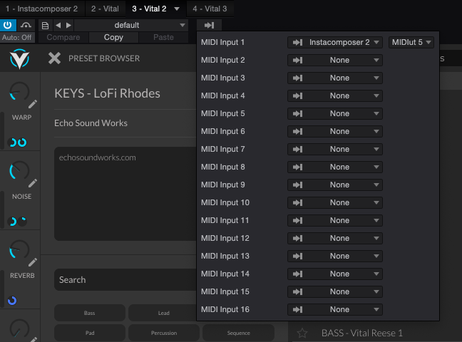 그 다음, 자동으로 연주하고 싶은 악기로 가서 어떤 트랙들을 연주하게 할 건지 사진과 같이 설정을 한다. 필자는 Vital에 코드 트랙을 연주하게끔 만들고 싶었기에 InstaComposer 2 - MIDI Output 5를 선택했다. 이후 재생을 하게 되면 자동으로 InstaComposer 2에 찍힌 멜로디대로 노트가 연주되게 된다. 다른 DAW들의 경우는 잘 모르기에 한번 검색해 보는 걸 권한다.