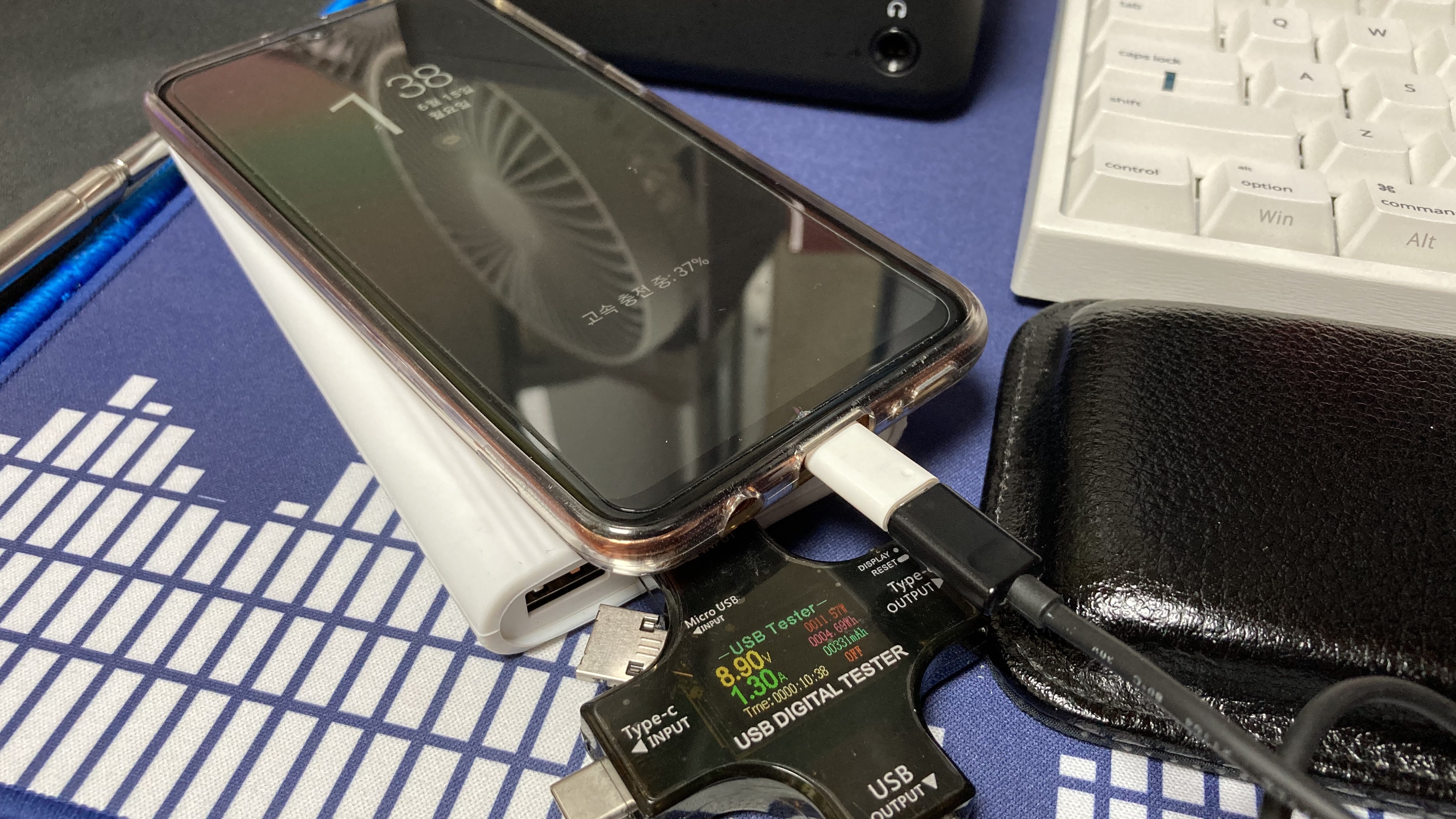 앞서 언급했듯, PowerBank 10000 3세대는 USB-C 단자로 출력을 지원하지 않기에, 일반적인 USB 단자에 USB 테스터를 물려 어느 정도로 전력을 공급해보는지 직접 측정해보았다. 일반적인 USB 단자에서도 평균적으로 9V/1.5A, 즉 15A 정도의 전류가 출력되는 게 확인되었다. 스마트폰의 배터리가 38%에서 100%까지 완충되는데 걸린 시간은 약 1시간 50분 정도가 걸렸는데, 80퍼센트 이상부터 천천히 충전된다는 걸 감안해도 1 퍼센트당 30초가 걸린 셈이다. 정말 빠르다.