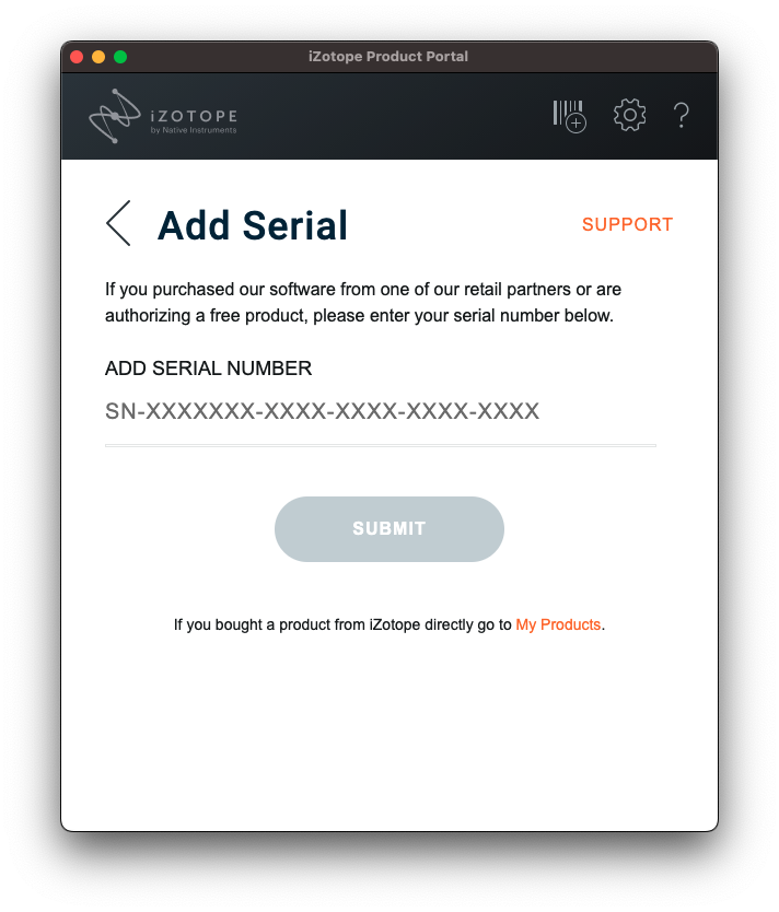 iZotope Product Portal을 설치했다면 구매한 iZotope 시리얼을 계정에 등록할 차례다. 우측 상단의 바코드 아이콘을 누르면 시리얼을 추가할 수 있는 페이지가 나오는데, 아까 구매한 시리얼 키를 넣은 후 Submit 버튼을 누르면 된다. 정상적인 시리얼 키라면 컴퓨터에 인증을 할지, 아니면 iLok에 인증을 할지 선택하는 창이 나오는데, 마음에 드는 걸 고르고 등록 과정을 진행하면 된다.