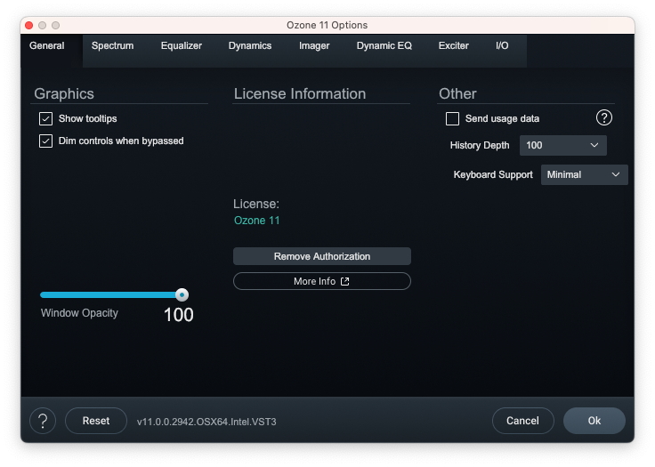Ozone 11을 사용하면 무언가 모듈들 설정을 하고 싶다면 우측 상단에 있는 톱니바퀴를 누르면 Ozone 옵션을 열 수 있다. 대부분의 설정들을 모듈 안에서 전부 할 수 있거나 기능이 그렇게까지 특별하지 않아 설정할 거리가 별로 없는 모듈을 제외하면 옵션에서 추가적인 기능들을 켤 수 있다. 보통은 미터링 관련 옵션들이지만 위상 틀어짐 방지나 부드러운 새츄레이션 등 상황에 따라 도움이 되는 기능들도 숨어 있으니 한번 확인해 보기를 권장한다.