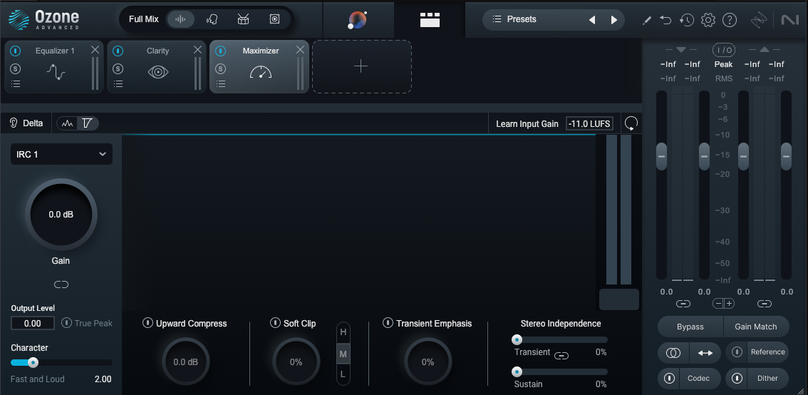 다만 이번 Ozone 11에 들어서 불만이 딱 하나 생겼다. 바로 디자인이다. 기능 추가나 편의성 개선 같은 업데이트는 언제든지 해도 환영이다. 그런데 디자인이 약간 비직관적으로 바뀌었다. 특히 필자가 자주 이용하는 Maximizer 모듈이 그러하다. 평소에 필자는 먼저 IRC 모드를 설정한 후, 아웃풋 레벨을 조절한 후 게인을 올려 대략적인 레벨을 확보한 후 작업하는 걸 선호한다. 그런데 Ozone 11로 업그레이드되면서 Maximizer 모듈에 새로운 디자인이 적용되었는데, 아웃풋 레벨과 IRC 모드 선택 창이 굉장히 간소화되었다. IRC 모드는 폴더 형태로 작게 바뀌었고 아웃풋 레벨은 게인 레벨 바로 아래에 작게 위치해 있다. 자주 손을 대는 기능들이 아니기에 작게 넣어도 되지 않을까?라고 iZotope에서는 판단한 모양인데 자주 쓰는 기능이 다운그레이드된 거 같아 마음이 아팠다. 여담이지만 역대 Ozone 디자인은 7이 가장 예뻤던 거 같다. 요즘 건 사이버틱하긴 한데 이전 대비 낭만이 많이 사라졌다.