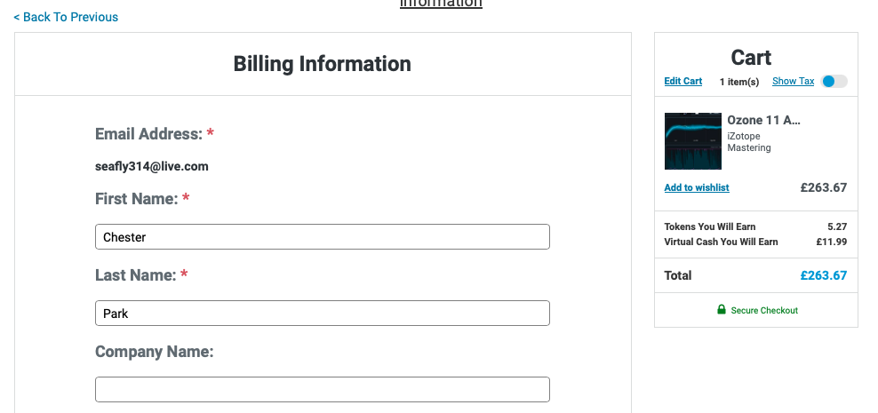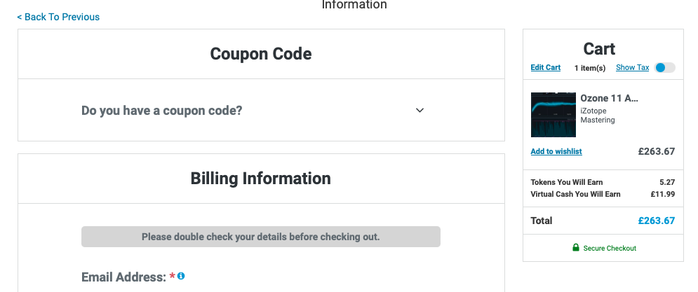본 페이지의 iZotope- Ozone 11 구매 링크 (PluginBoutique)를 클릭하거나, Plugin Boutique(링크)에 접속한 후, 검색창에 "Ozone 11"를 검색하면 위와 같은 화면이 나타난다. 필자는 Ozone 11 Advanced 버전을 기준으로 서술을 하려 한다. Plugin Boutique는 회원 가입을 하지 않아도 상품 구매가 가능하지만, 회원 가입을 하는 편이 추후 라이센스 관리에 용이하다. 기본값은 파운드화로 나타나지만 달러나 엔, 유로화로 가격을 바꿔가며 확인할 수 있다. 다만, 대한민국 원은 지원하지 않으므로 해외 결제가 지원되는 카드나 페이팔 계정을 미리 준비할 필요가 있다. Add to Cart를 클릭하여 상품을 내 장바구니로 담자.