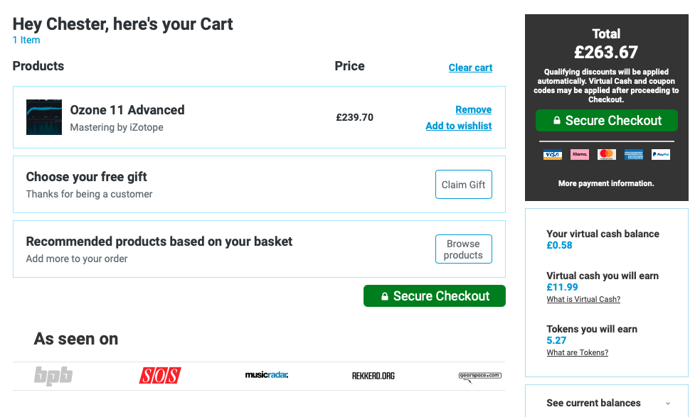 홈페이지 상단 우측에 자리 잡은 Cart를 누르면 다음과 같은 화면이 나타난다. 이 화면에서는 이번 구매로 적립되는 캐시, 구매로 적립되는 토큰을 확인할 수 있으며 상품 구매로 받을 수 있는 무료 선물을 선택할 수 있다. 만일 Plugin Boutique에서 처음 구매한다면 Claim Gift를 클릭해서 무료 선물을 받아가는 게 좋다. 플러그인 하나만 샀을 뿐인데 공짜로 다른 플러그인들도 가져갈 수 있다. 무료로 받을 수 있는 플러그인들은 기간에 따라 다르니 미리 구매 전에 어떤 걸 무료로 주는지 체크해 보는 것도 좋다. 모든 작업이 완료되었다면 초록색 "Secure Checkout"을 눌러 다음 화면으로 넘어가자.