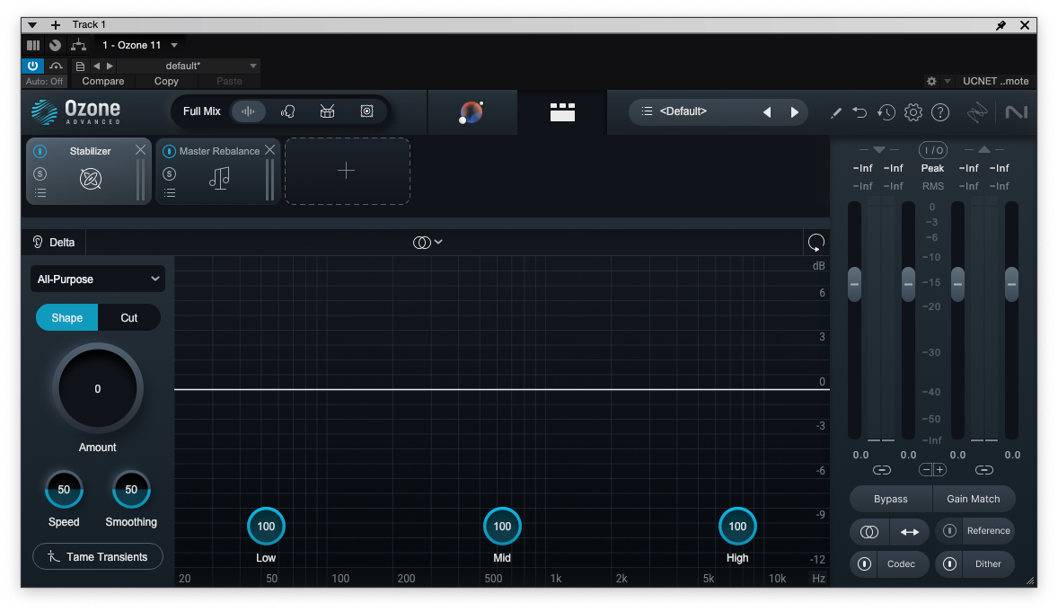 Ozone 11에는 새로운 기능이 하나 추가되었다. Stem Focus라는 이름의 신기능은 Advanced에서만 사용할 수 있지만, iZotope가 밀고 있는 AI 기술이 도입된 기능이다. 좌측 상단에 생긴 4개의 아이콘이 바로 Stem Focus다. Full Mix, Vocal, Drum, Bass의 4가지 옵션을 고를 수 있고, 2 Mix로 이루어진 wav파일이더라도 AI 분리 기술을 이용해 보컬 / 드럼 / 베이스만 강조해서 들려준다. 실시간으로 작동하는데 아직 퀄리티는 좋지 않다고 느꼈다. 어찌 보면 Master Rebalance의 상시 작동 기능이라고 보면 될 듯하다. 장르에 따라 드럼이나 베이스가 중요한 음악들이 몇 있는데 Stem Focus 기능을 활용하면 보다 디테일하게 마스터링 작업을 할 수 있을 듯하다.