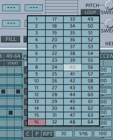 스탭 시킌서는 최대 64까지 설정할 수 있다. 특이하게도 1부터 64 사이의 간격을 직접 설정할 수가 있다. 원한다면 클랩을 40까지만 스탭 시퀸서로 찍고 루프를 돌릴 수 있다는 뜻이다. 루프를 끌 수도 있어서 특정 구간에서만 재생할 수 있도록 설정하는 것도 된다.